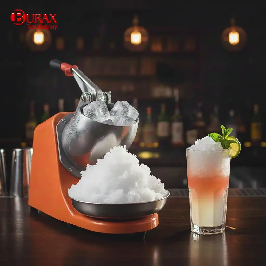یخ پودری یا برفی (Shaved/Snow Ice): بافت بسیار نرم و دانههای ریز، که برای تهیه شربتهای یخی (اسلاش)، کوکتلهای خاص، و دسرها کاربرد دارد.